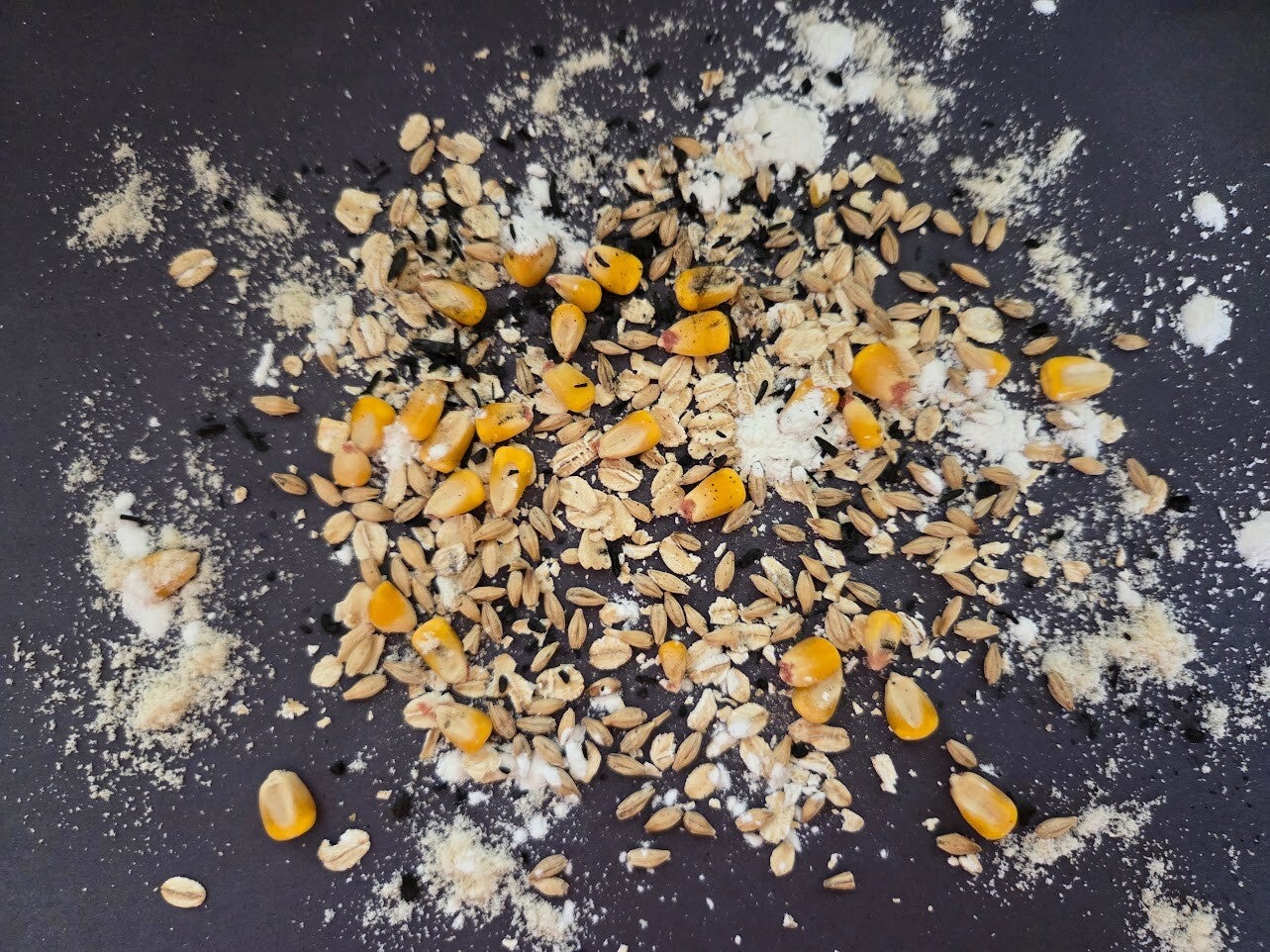 Our worm grub is a varying mixture of different grains, such as, Coconut flour, alfalfa meal, corn meal, rolled oats, barley, biochar, and possibly more as we research and experiment with our own bins. Grains and biochar aid in worm growth and reproduction. A happy, healthy worm is a productive and reproductive worm.